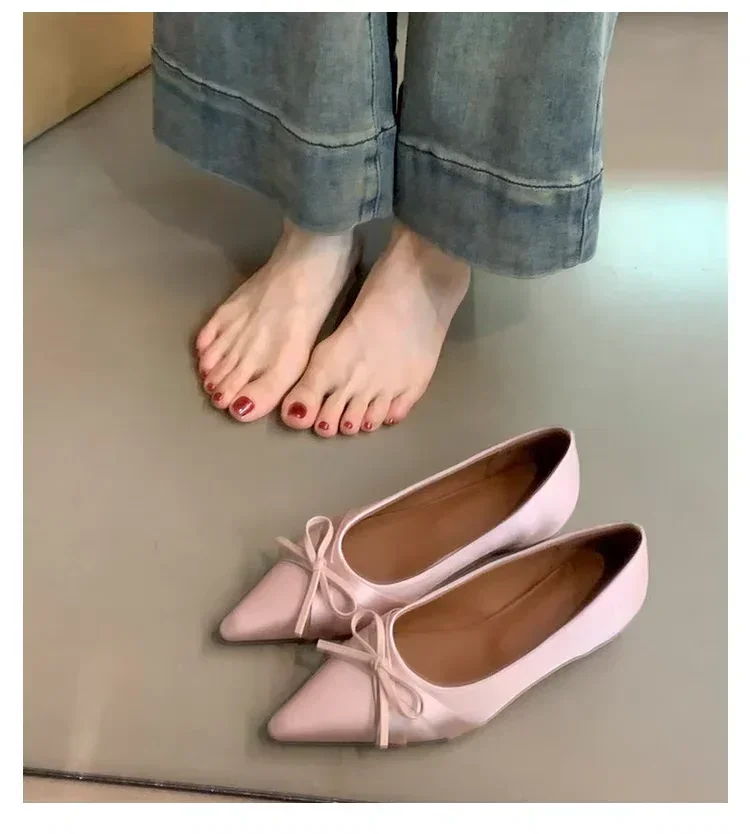 Ballet-Style Satin Flat Shoes, Comfortable, Non-Slip, Pointed Toe, Bow-Adorned